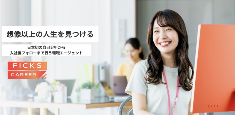 FICKS CAREERは、株式会社FICKSが運営する転職エージェントです。「想像以上の人生を見つける」をモットーに、独自の自己分析コーチングを行い、その人に合った仕事や企業を紹介してくれます。