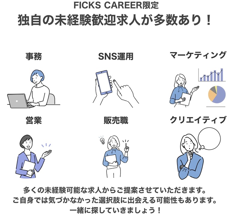 「今の仕事は向いていない気がする」「経験はないが新しい仕事にチャレンジしてみたい!」という人はFICKS CAREERに相談するとよいでしょう。