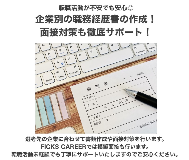 FICKS CAREERでは、応募企業に合わせた書類作成のサポートはもちろん、面接対策もしっかり行ってくれます。
